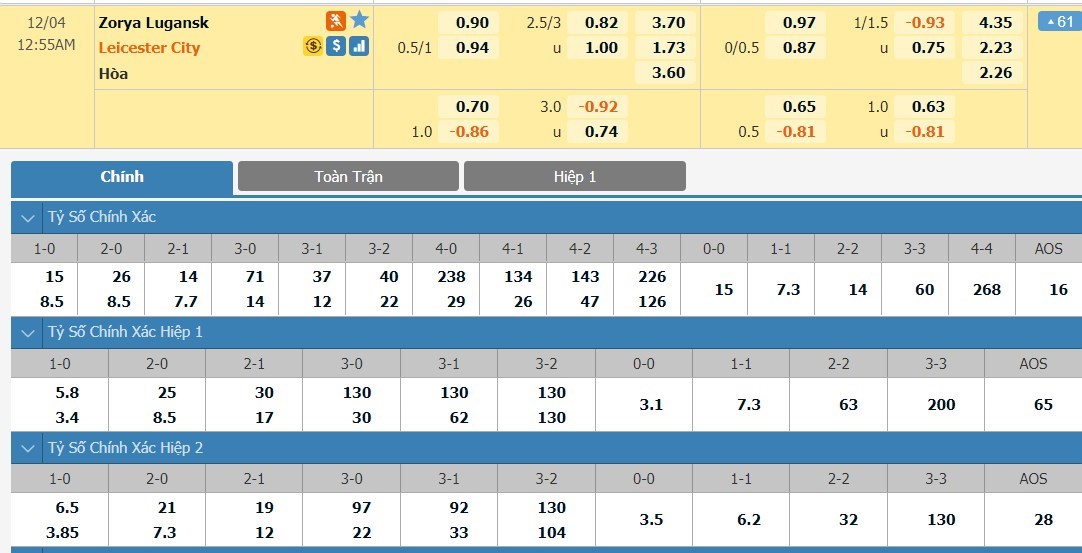 Theo chuyên gia phân tích thị trường cá cược Lucky88, tỷ lệ kèo chấp của trận đấu này thể hiện được sự chênh lệch. Mốc chấp -3/4 bàn dành cho các cầu thủ đội khách là con số đến từ kết quả thắng 3-0 ở lượt đi cho đại diện Premier League. Tuy nhiên, Leicester City đang có dấu hiệu sa sút khi không thắng 3 trận gần nhất. Bầy Cáo đã chắc suất đi tiếp nên có thể có phần chủ quan. Tỷ lệ Zorya Luhansk +1 bàn sẽ là rất an toàn. 90 phút lượt đi, Zorya Luhansk không thể có cho mình bất kì bàn thắng nào vào lưới của Leicester City. Đại diện Ukraine đang bay cao với hàng thủ chắc chắn khi mà đã không có bàn thua nào ở 3 trận gần nhất. Leicester City sau chuỗi trận đáng thất vọng vừa qua có lẽ sẽ không chơi nhanh từ đầu.